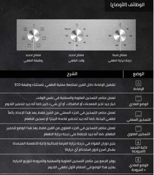 - إضاءة داخلية لرؤية الطعام أثناء الطهي