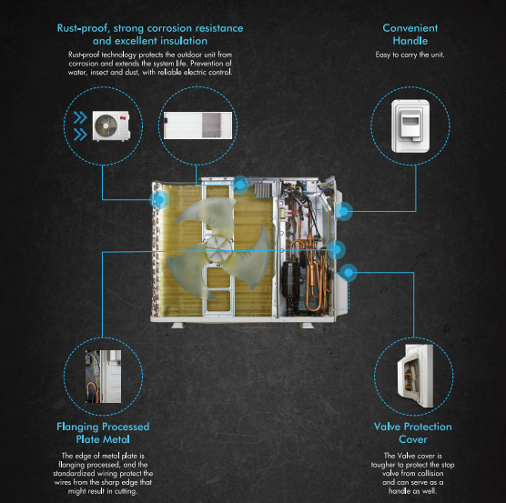 - تقنية مقاومة الصدأ تحمي الوحدة الخارجية من التآكل وتطيل عمر النظام.