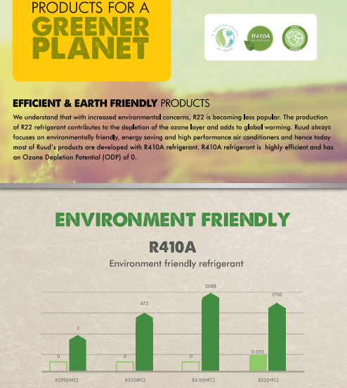 تركّز شركة RUUD على تصنيع مكيفات هواء عالية الأداء وصديقة للبيئة، موفرة للطاقة، ومعظم منتجاتها اليوم تعمل بغاز التبريد R410A.