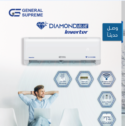 🌡️ مكيف جنرال سوبريم دايموند بلو إنفيرتر 12 ألف وحدة – بارد / حار – بقوة تبريد 12,000 وحدة – موديل: GSINV12H ريش ذهبية 🟡 / تنظيف ذاتي 🧼 / توزيع هواء في 4 اتجاهات 🔄 / خاصية الاستشعار 🎯