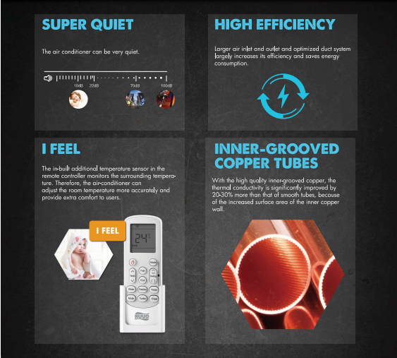 - يعمل المكيف بهدوء شديد، مما يوفر بيئة مريحة وهادئة سواء أثناء النوم أو العمل أو مشاهدة التلفاز.