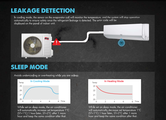 - إذا تم اكتشاف تسرب في غاز التبريد، يتوقف النظام تلقائيًا لضمان السلامة.